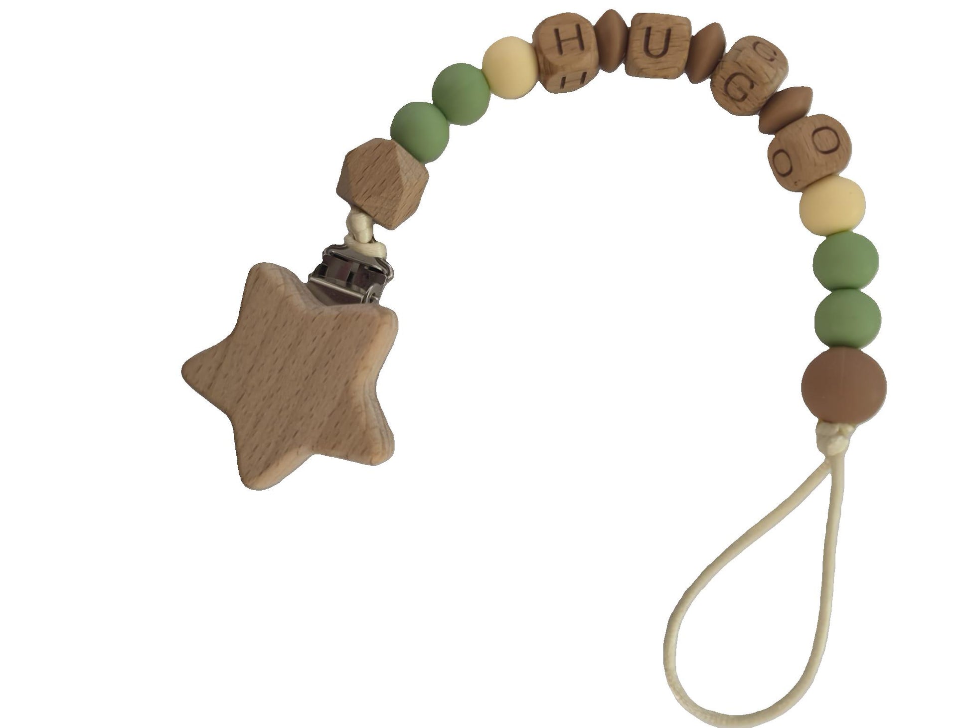 Chupetero de madera y silicona, seguro y elegante, personalizado con el nombre del bebé. ¡Un regalo único e inolvidable!