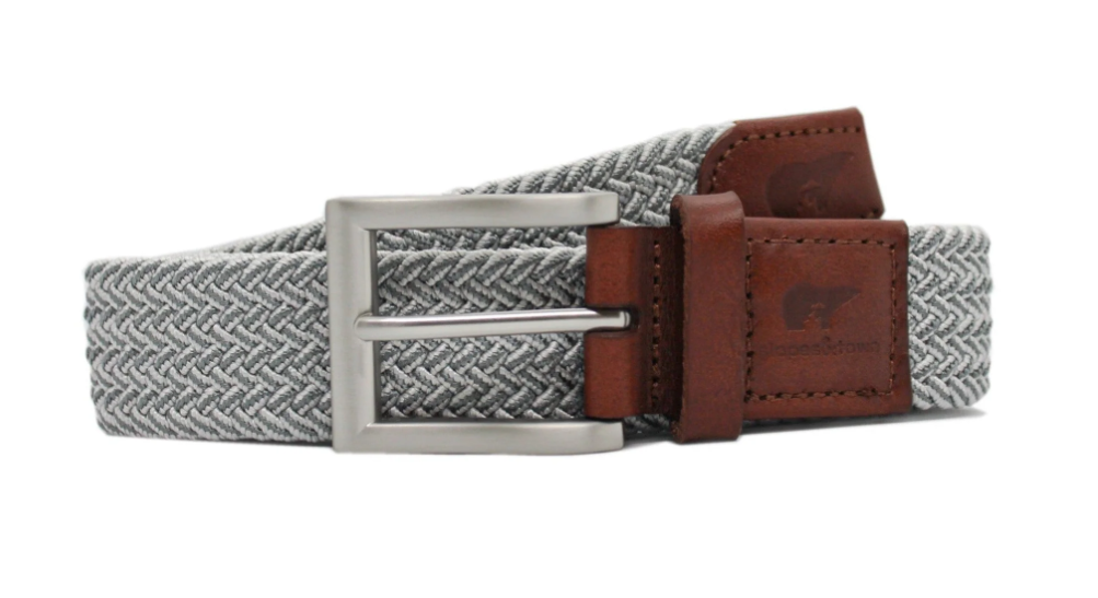 • Ceinture élastique et réglable Virgil gris/argent, 105-135 cm, en plastique recyclé certifié Global Recycled Standard. Garniture en cuir marron et boucle argentée.