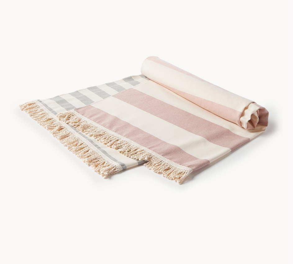 Serviette de plage portugaise, dans les tons rose, gris et beige. Il mesure 100 x 180 cm et est composé à 100 % de coton avec un grammage léger de 210 g/m² pour une qualité durable.