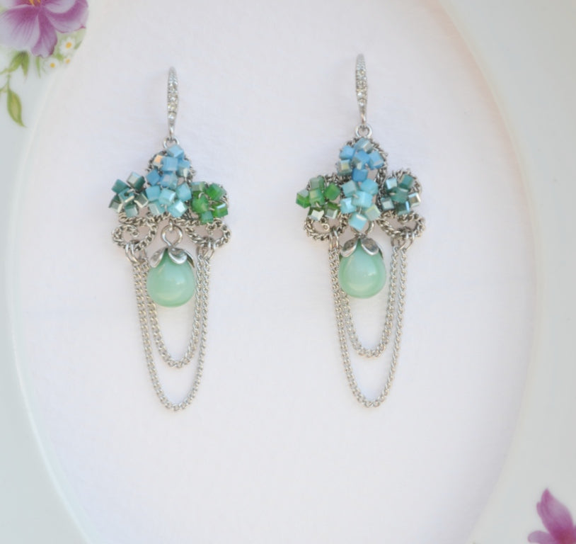 De charmantes boucles d'oreilles, où gemmes vert d'eau et chaînes en argent évoquent les tendres murmures des vagues de l'océan sous le clair de lune.